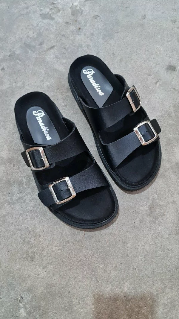 Detalle hebillas color niquel - Altura de la base: 3,5 cm.